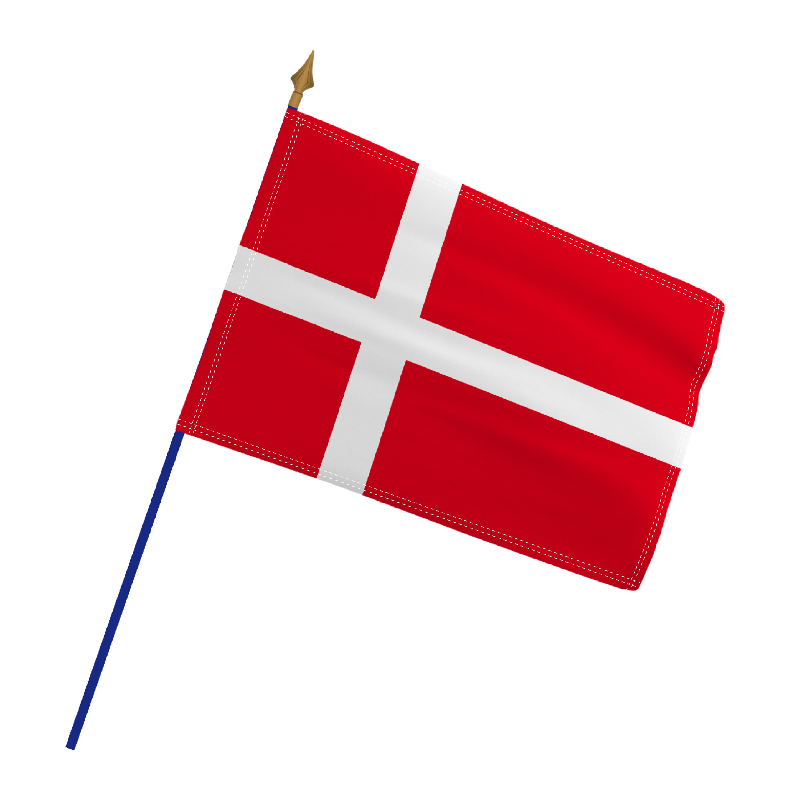 Chaque drapeau est fixé par fourreau sur une hampe en bois gainée de plastique bleu et terminée par une lance couleur bronze. La confection en double piqûre garantit une résistance accrue, que votre drapeau soit installé en intérieur ou exposé aux conditions extérieures.