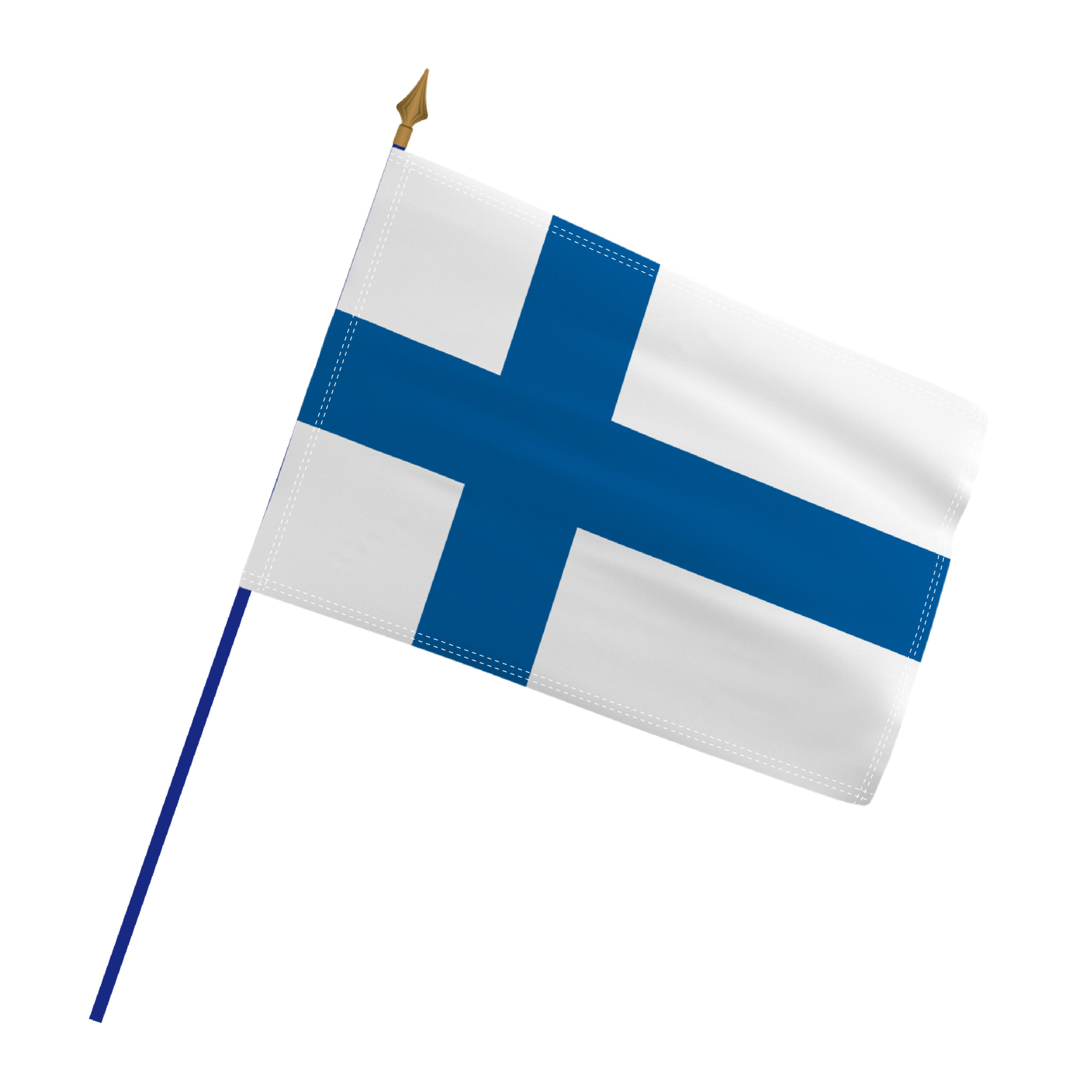 Le drapeau de la Finlande est assemblé par fourreau puis agrafé sur une hampe en bois enveloppée de plastique bleu et terminée par une lance couleur bronze. Les coutures sont réalisées en double piqûre, une technique de confection qui garantit une tenue irréprochable face au vent et aux intempéries.