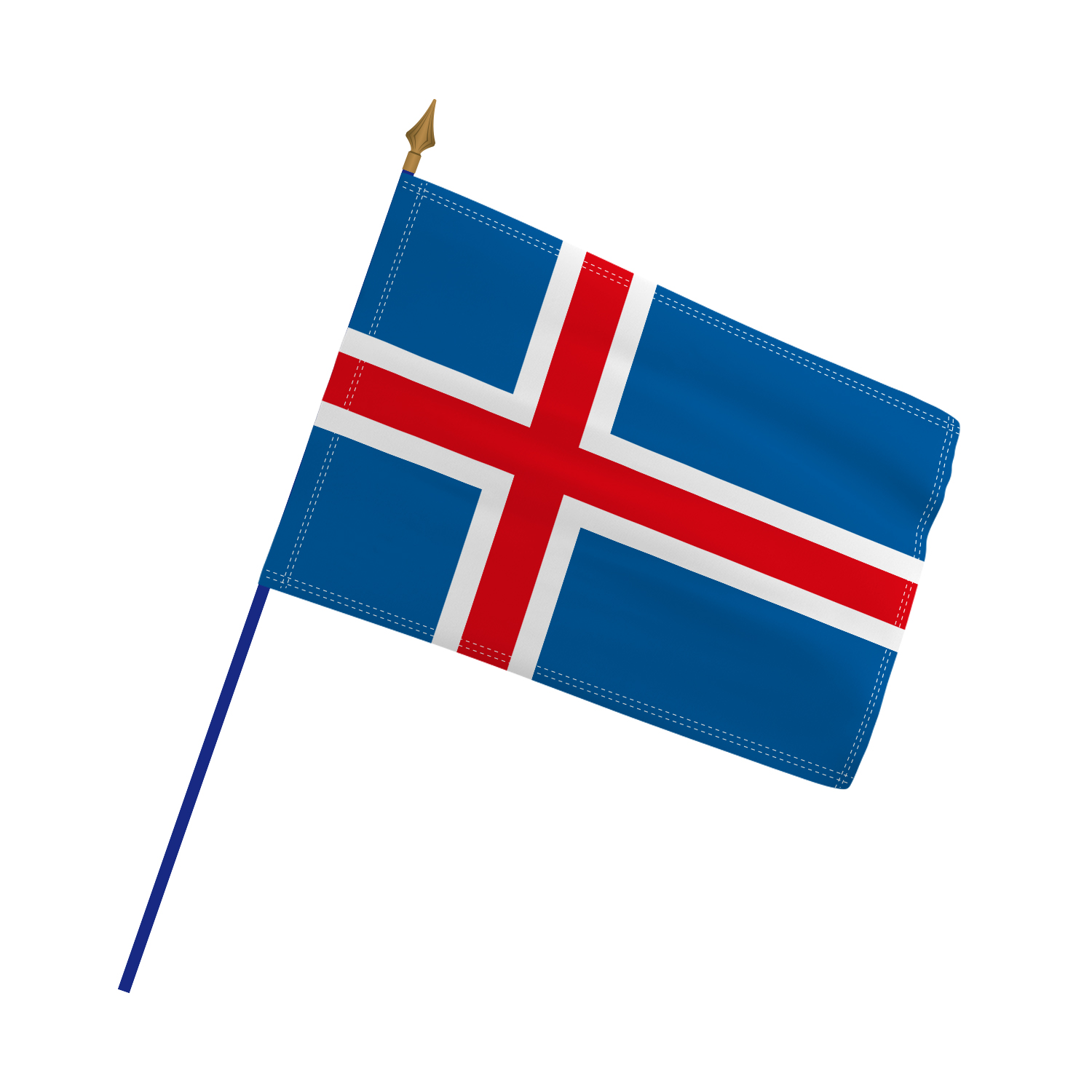 Le drapeau a été conçu en 1915 par Matthías Þórðarson et officiellement adopté en 1918 lorsque l’Islande est devenue un royaume souverain en union personnelle avec le Danemark. Il a conservé son design lors de la proclamation de la République le 17 juin 1944. Le bleu évoque les montagnes et l’océan Atlantique qui entoure l’île, le blanc représente les glaciers et les neiges qui recouvrent le pays, tandis que le rouge symbolise le feu volcanique qui façonne les paysages islandais.