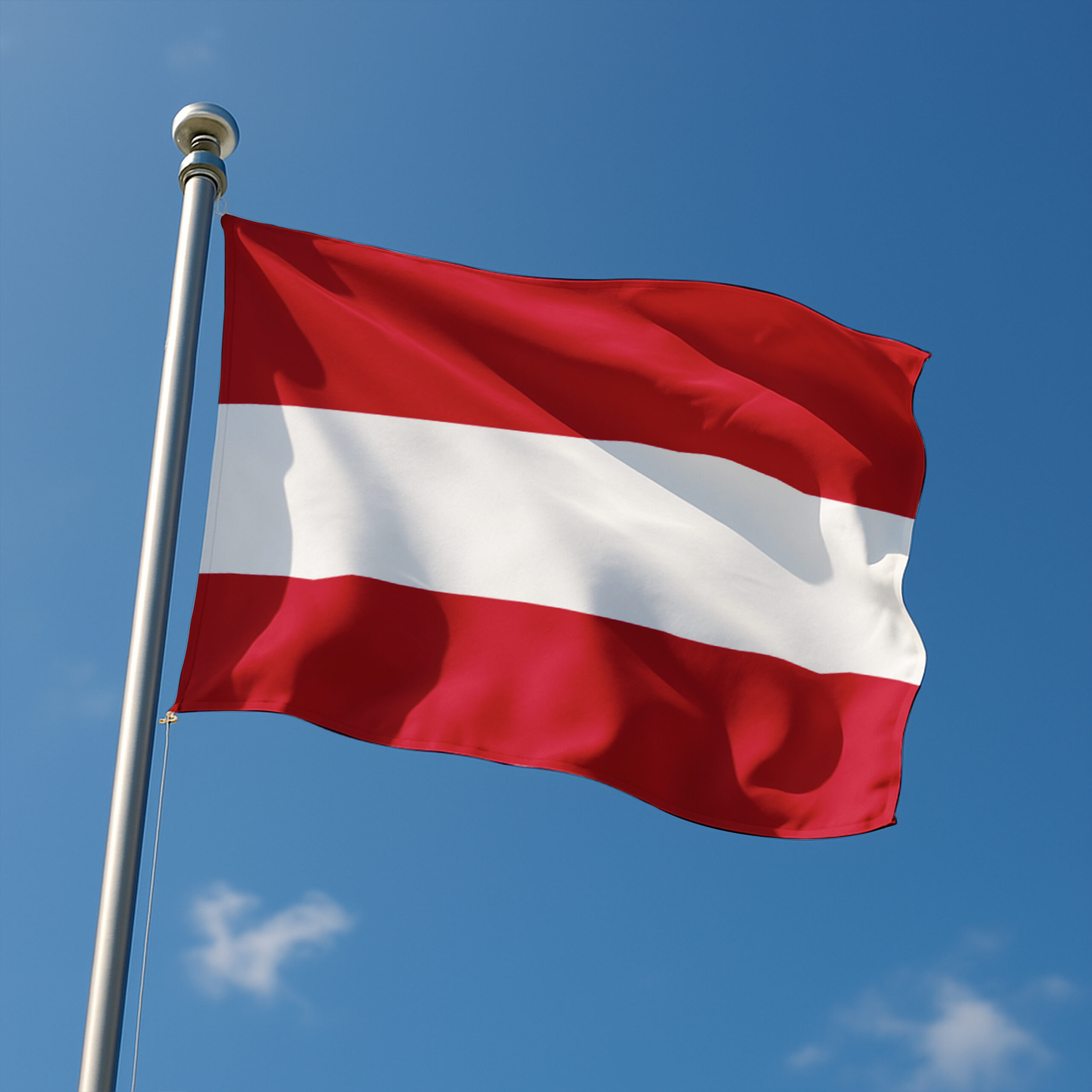 Le pavillon de l’Autriche est imprimé et cousus avec une double piqûre afin de le solidifier, montés sur une sangle synthétique blanche avec des anneaux brisés en haut et en bas.