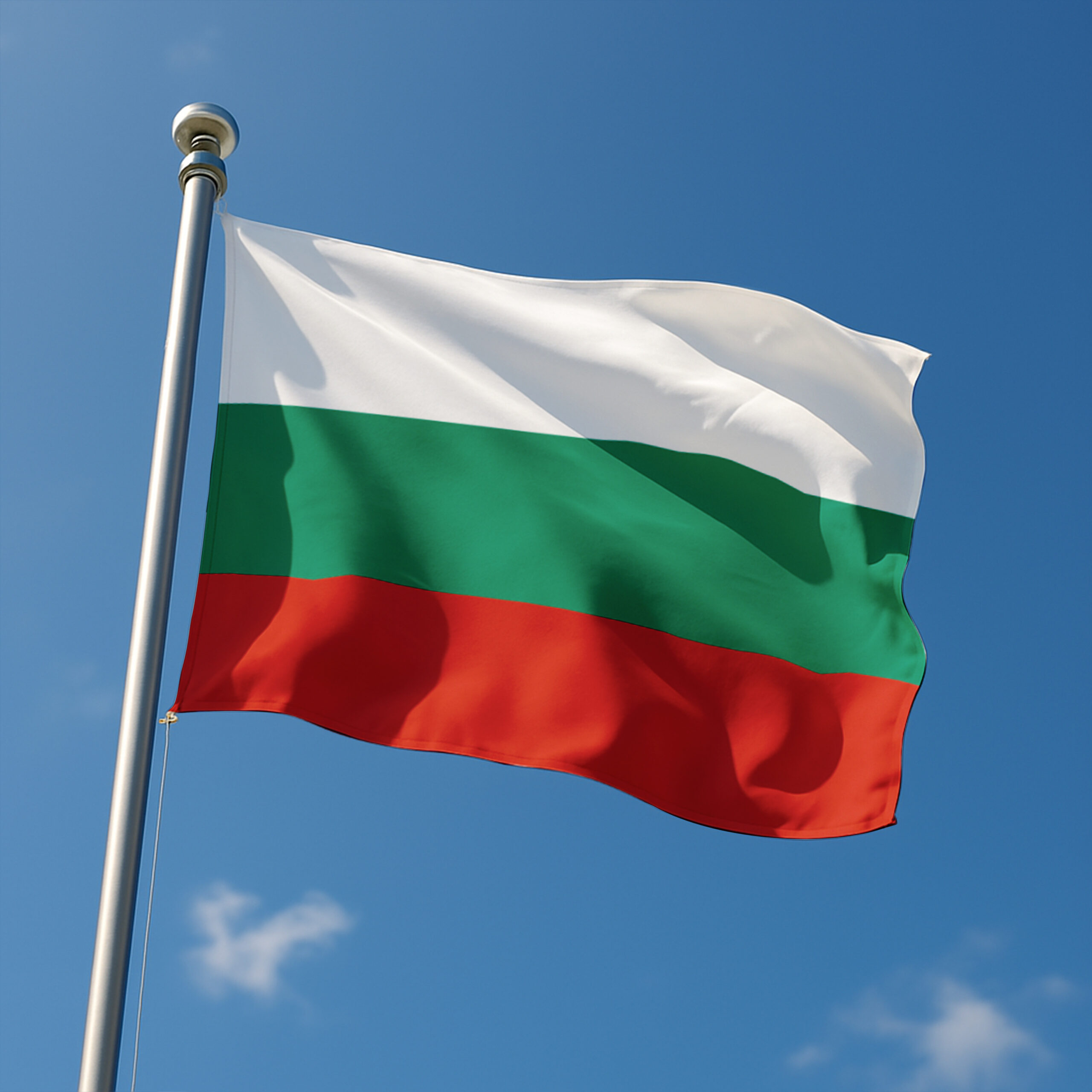 Le pavillon de la Bulgarie est imprimé et cousus avec une double piqûre afin de le solidifier, montés sur une sangle synthétique blanche avec des anneaux brisés en haut et en bas.